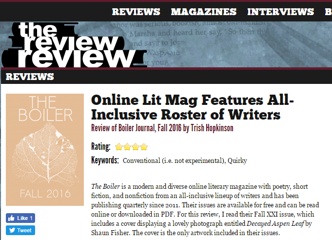My review of The Boiler’s Fall 2016 issue just went up on The Review Review! Just last year I sent a request to join the ranks of the literary reviewers on their site and this is the fourth lit mag they’ve asked me to read and write about. The first two were print issues, meaning, not only did it give me motivation to read a new lit mag from cover to cover, but I received them for no cost!