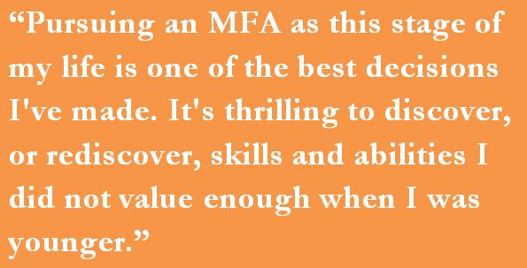 In June, my husband Dan and I were on a road trip out to California to see our son. Somewhere in the Rockies, I said to him, “You know, I think it’s time I went back to get that MFA.” When we returned home, I applied, was accepted, and by August, was attending my first poetry residency at Miami University in Oxford, Ohio. I am 53 years old.