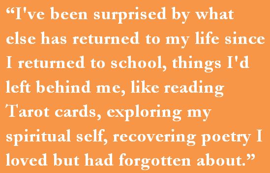 I’ve been surprised by what else has returned to my life since I returned to school, things I’d left behind me, like reading Tarot cards, exploring my spiritual self, recovering poetry I loved but had forgotten about. Returning to poetry has created lovely synchronicities, like discovering that the poet Lorine Niedecker, whom I now admire greatly, yet had never heard of until poetry workshop, was briefly a student at my undergraduate alma mater, Beloit College, or that I’ve alluded to a bit of John Donne in a draft, only to discover that my mentor is currently re-reading his work. These kind of happy coincidences signal to me that I am on the right path.