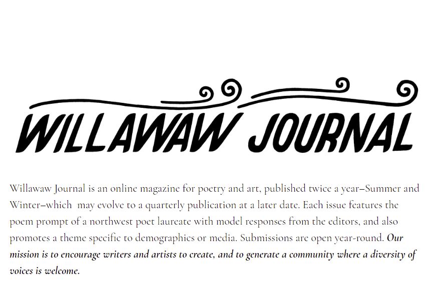 Willawaw Journal is a new online literary journal of poetry and art, published quarterly. The unique thing about Willawaw is that each issue has a poem prompt or mentor poem from a poet laureate! The featured poet laureate for the Spring issue is Paulann Petersen. Each issue is also themed based, but may evolve in the future at the editors’ discretion. Check their guidelines for current themes.