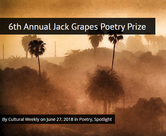 Cultural Weekly's 6th annual Jack Grapes Poetry Prize is open! This year they are awarding three winners and six finalists. The three winners will receive $200 each, plus publication. The six finalists will receive $50 each, plus publication.
