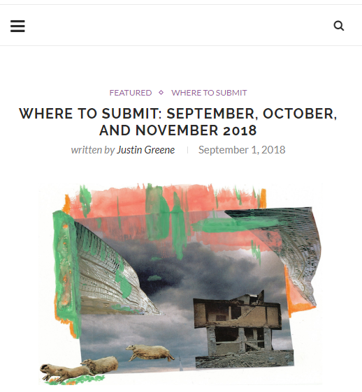 They recently posted an article on where to submit in September through November. Click here to read the complete article. I've filtered the list below to those whose deadlines have not yet past, have no fees, and accept poetry submissions. There are some paying markets. Read all the guidelines carefully before submitting your work.