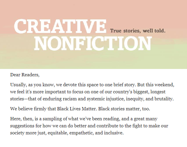 This is an incredible list from The Creative Nonfiction Foundation via their email series Sunday Short Reads, including suggestions for how we can do better and make our society more just, equitable, empathetic, and inclusive. There’s so much information being shared, I appreciate this list of key articles, organizations, and links. Follow the links below to read more and take action if you are able.
