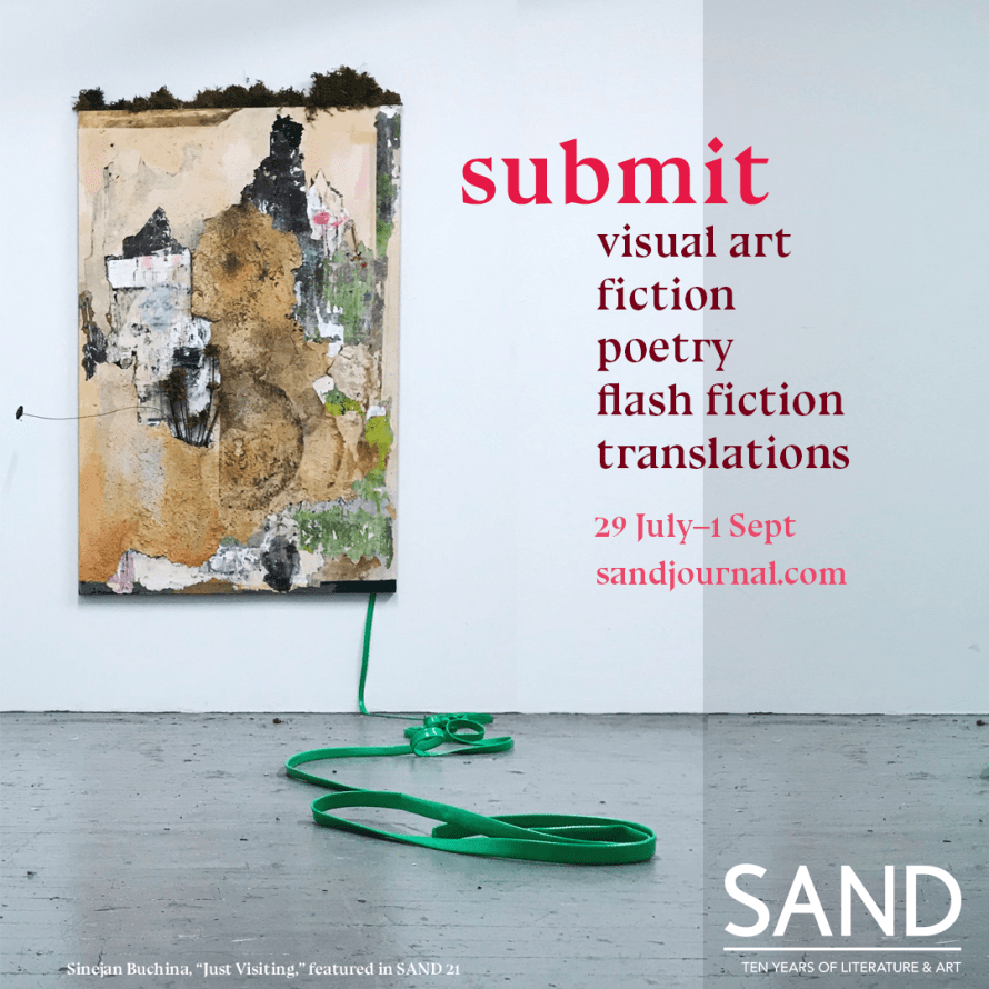 SAND: We're currently open for poems, short fiction, flash fiction, translations, and visual art. We are eclectic and look for submissions that push the boundaries of form, language, message, and voice in fresh and unpredictable ways. Work that is haunting for its soul, edge, truth. We are all about work that subverts, whether subtly or overtly. Fresh can be slow, sensitive can be rough, bold can be quiet.