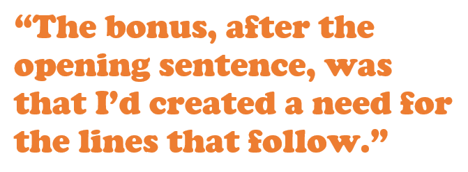 The bonus, after the opening sentence, was that I’d created a need for the lines that follow. What are the usual reasons? Probably money (boring), so I skipped ahead to my unusual reason. And after that, the rest was just logical progression, imagery, and a turn before the final closure. By “turn” I mean a redirect—saying something different, or reaching out to the reader; anything so long as it feels like you’ve moved away from the main idea/mood/scene into Act 3.