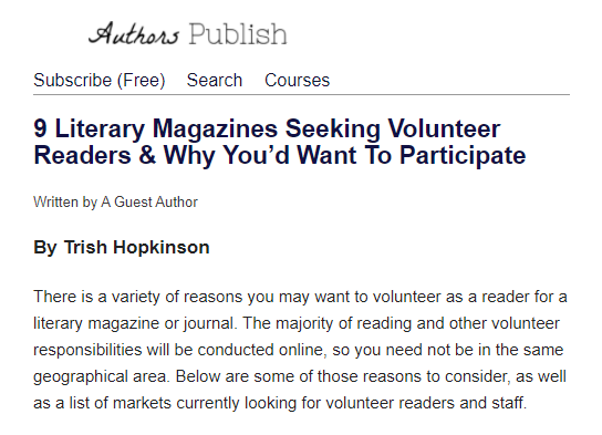 Thank you to Authors Publish for publishing my article on their resourceful site! If you’re wondering how to become more involved in the literary community and why you’d want to, click the link below for five reasons to volunteer for a publication, including: gaining experience, meeting other writers, improving your own writing and submissions approach, along with literary citizenship. All this followed by a list of nine literary magazines currently open to volunteer applications.
