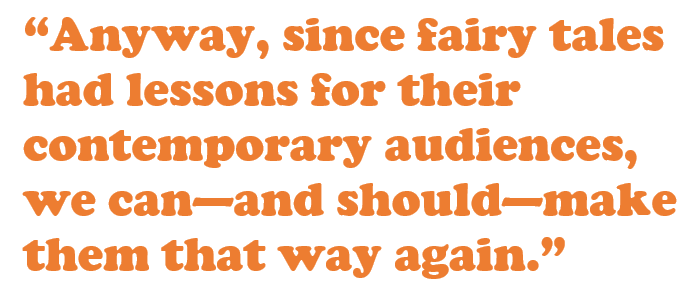 Anyway, since fairy tales had lessons for their contemporary audiences, we can—and should—make them that way again. Re-contextualize. Change the lingo and wardrobe so that the characters look and sound more like us. That way the moral, or the wrong thing that needs to be called out, hits us in the gut and heart again today.