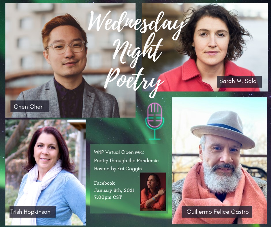 Tune in this Wednesday evening on January 6th at WNP Virtual Open Mic, Poetry Through the Pandemic, Volume 43, hosted by Kai Coggin, featuring Chen Chen, Sarah M. Sala, Guillermo Filice Castro, and Trish Hopkinson.