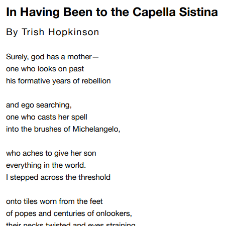 Many thanks to Existere for publishing my poem “In Having Been to the Capella Sistina” about exactly that, a not too long ago visit to the Sistine Chapel in Vatican City that feels worlds and worlds away. Just as I was finding the means to travel and the inspiration of experiencing in person the fine art I’d only ever seen in photos, the pandemic took hold and I resorted to virtual museum tours via digital screen. The lines from my poem “compare the scene to all / the kitsch—mugs and mousepads, / postcards and pamphlets, / digital images—zoomed in / on god’s finger reaching” seem far too real and much less ironic than I originally meant them to be.