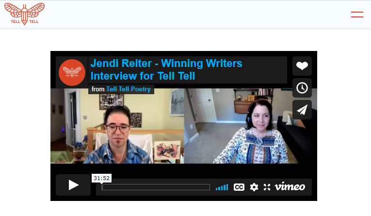 Welcome to the fourth interview in my 12-part poetry submissions interview series for Tell Tell Poetry with Jendi Reiter, vice president of Winning Writers! Jendi and I someone I’ve been in touch with online since my early days of seeking publication. Listen in as we chat about how Winning Writers started, their vision for promoting free writing contests, and what’s coming up next for them. Hear about how to avoid submission pitfalls and all the resources Winning Writers has to offer for new, emerging, and seasoned poets and writers.