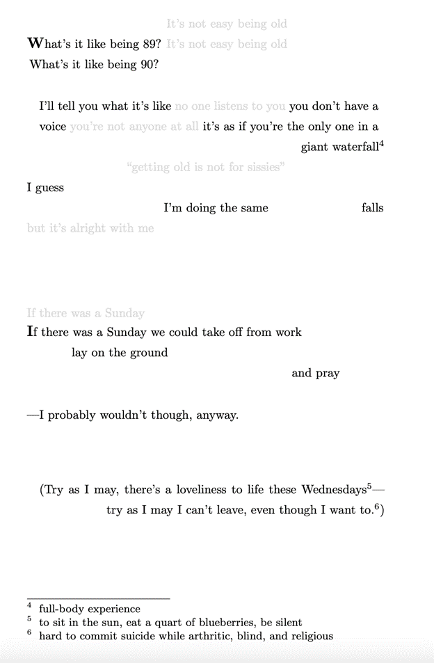 Later, I transcribed what I’d sung, put a shape to the text, used greyed-out fonts to de-emphasize some parts, and added some footnotes. Here’s one page: