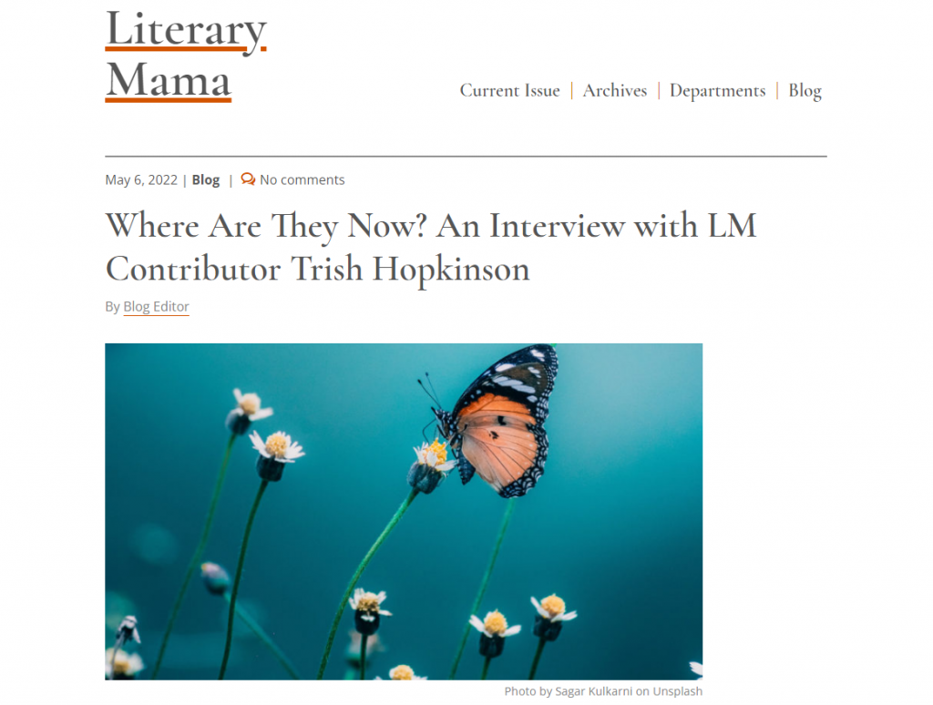 It was a great pleasure to be interviewed by Christina Consolino, Senior Editor for Literary Mama. Literary Mama is open for submissions year round. They publish literary writing about the many faces of motherhood. Since 2003, they have celebrated “the physical, psychological, intellectual, and spiritual processes of becoming a mother through words and images that may be so stark it hurts.” If you aren’t familiar with Literary Mama, set aside an hour or two with a glass of your favorite adult beverage and check out the variety of talented writers they publish. In addition to their own submission calls, Literary Mama posts a list of calls for submissions for their readers on the first Wednesday of every month. You can also follow them on Facebook and Twitter to get updates on other calls as they come up.