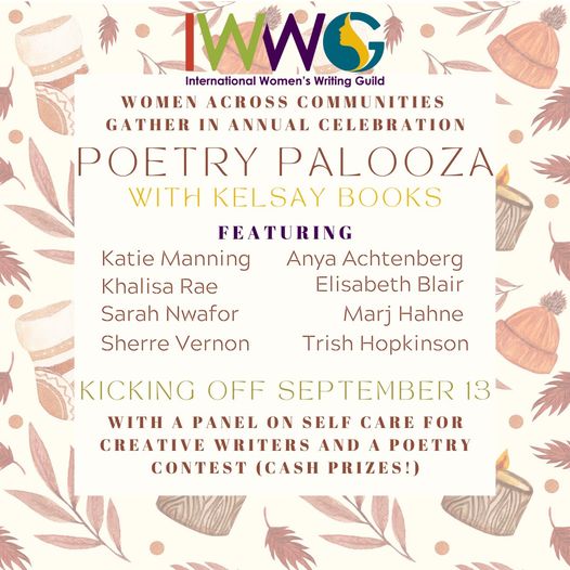 I’m pleased to announce the International Women’s Writing Guild‘s fall programming for Poetry Palooza! I’ll also be hosting the free kick-off panel with a stellar lineup of poets, writers, and educators to talk self-care for creatives on Tuesday, September 13 at 7pm Eastern Time.