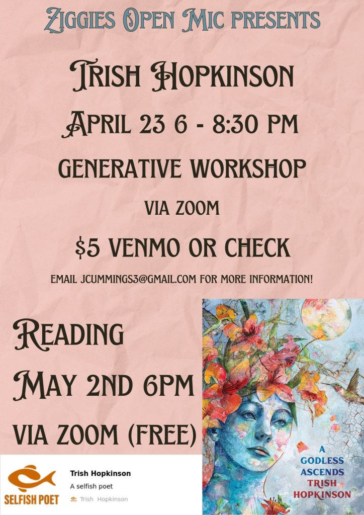 May 2, 2024, 6pm MT – Feature reader at Ziggies Open Mic (virtual)