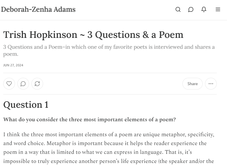 It was a great pleasure to be interviewed by Deborah-Zenha Adams for her 3 Questions & a Poem interview series via substack. She recently launched this substack to provide “[t]ips, tales, and tons of advice from professional writers and editors to help you on your writing journey.” You can subscribe for free content or for additional content via the paid option for a very reasonable $5/month.
