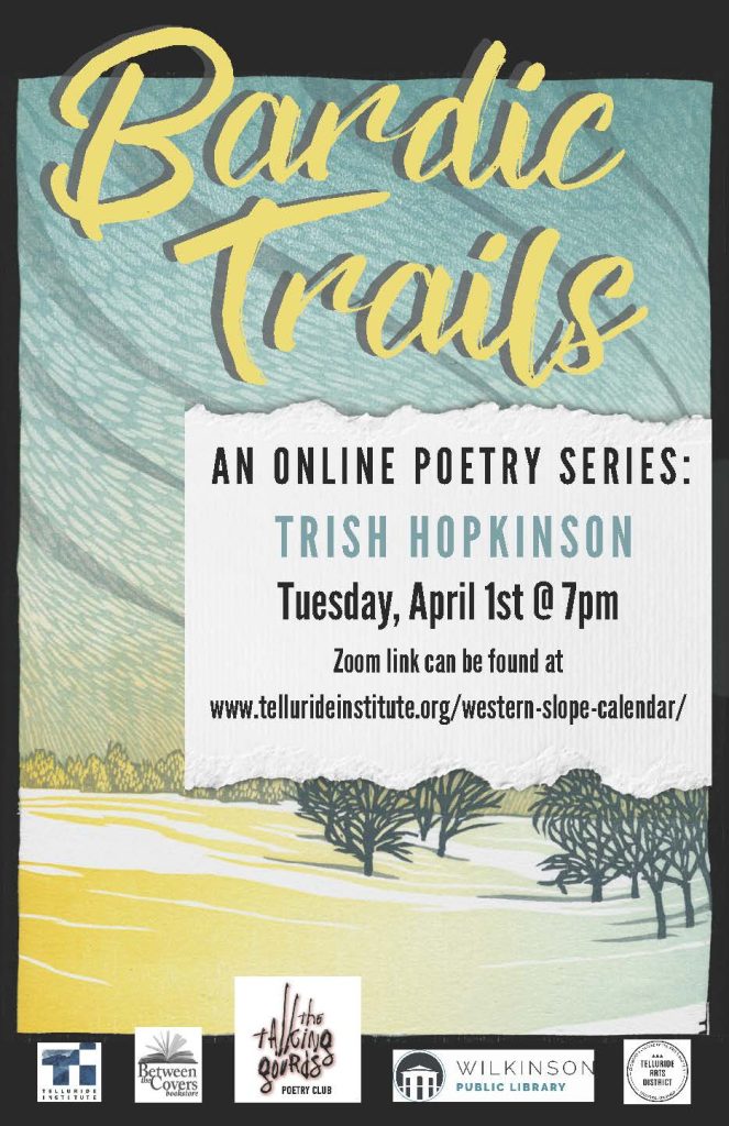 The Telluride Institute’s Talking Gourds Poetry Program hosts the free Bardic Trails virtual zoom series on the first Tuesday of each month. The Wilkinson Public Library continues as our collaboration partner and fiscal agent, with town support from Commission for Community Assistance, Arts & Special Events.