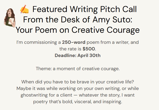 This pitch call is for GuestStack, the creative column inside From the Desk of Amy Suto — a Substack newsletter and writing job board with over 7,600+ readers. Amy is a six-figure freelance writer, author, and helping writers make storytelling their full-time job. From the Desk of Amy Suto is a Substack newsletter and writing job board, including a Monday and Thursday round-up of the best freelance writing jobs and opportunities from around the web, and Featured Jobs where clients reach out to her directly with opportunities for my community of writers.