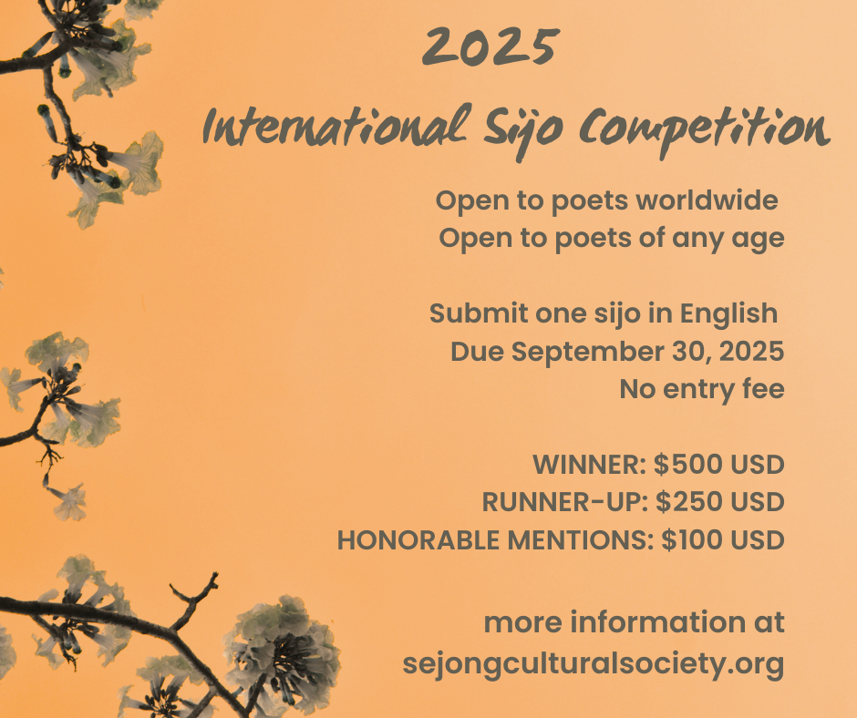 The Sejong Cultural Society is a 501(c)(3) not-for-profit organization founded in Chicago, IL in 2004. They are currently open for no fee entries for their Sejong International Sijo Competition. The sijo is a traditional three-line Korean poetic form organized technically and thematically by line and syllable count. Click here for a basic guide on writing sijo.