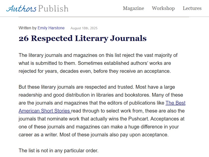 Another great list of literary journals from our friends at Authors Publish! Not to mention additional resource links, some stats, and of course all of these respected journals don’t charge submissions fees. The list is not in any particular order.