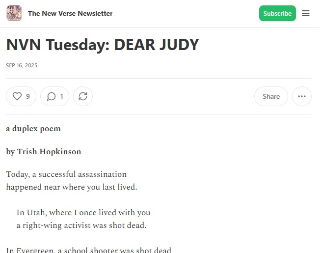 My sincerest gratitude to New Verse News for publishing my duplex poem “Dear Judy” earlier this week. The events of September 10 were heartbreaking. Two people died that day. One person assassinated in the state where I lived most of my life and one in my new home state of Colorado. Two children were critically injured in the school shooting in Evergreen. I’ve been writing epistolary duplex poems to my mother, who passed unexpectedly in January 2024. Not all of the poems are related to current events but they have been a way for me to still talk to her, tell her things I need to, feel close to her. This is the first one published.
