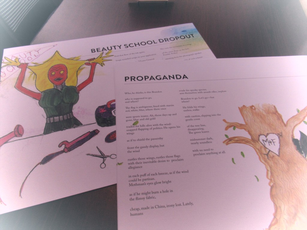 One Monday evening, I told Sally with a shy yet sly smile that I’d been working on a small collection of poems “just for my sanity.” And I had been—I’d imagined a world where cryptids like the Mothman and Flatwoods Monster encountered very human issues and problems. Mothman needed to update his LinkedIn profile, and Beauty School wasn’t going so well for the Flatwoods Monster. But they also heard the ambulances in the hills trying to help overdose victims and tried to make sense of abandoned mines and a fraught political landscape.