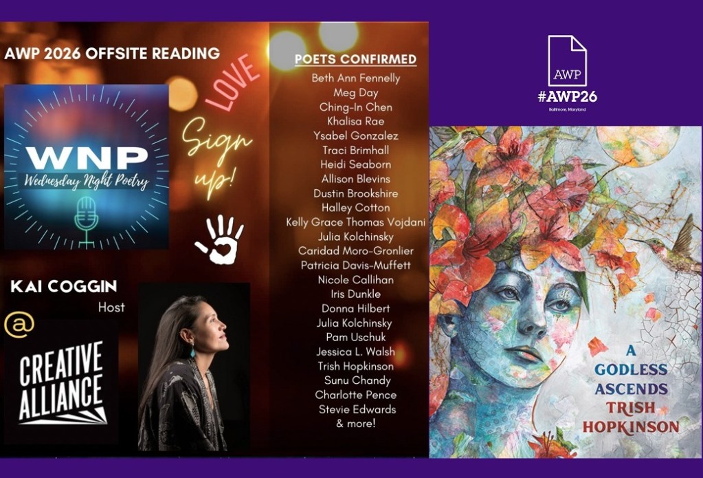 An exceptional way to kick off AWP is with this off site event organized by Kai Coggin of Wednesday Night Poetry in conjunction with Creative Alliance and sponsored in-kind by Google for Education. The lineup is amazing as always, including Meg Day, Traci Brimhall, Allison Blevins, Dustin Brookshire, and many, many more! I hope you’ll join us at the Historic Patterson Theater at The Creative Alliance, 3134 Eastern Avenue from 5:30-10:30pm. I’ll be reading during the second half.