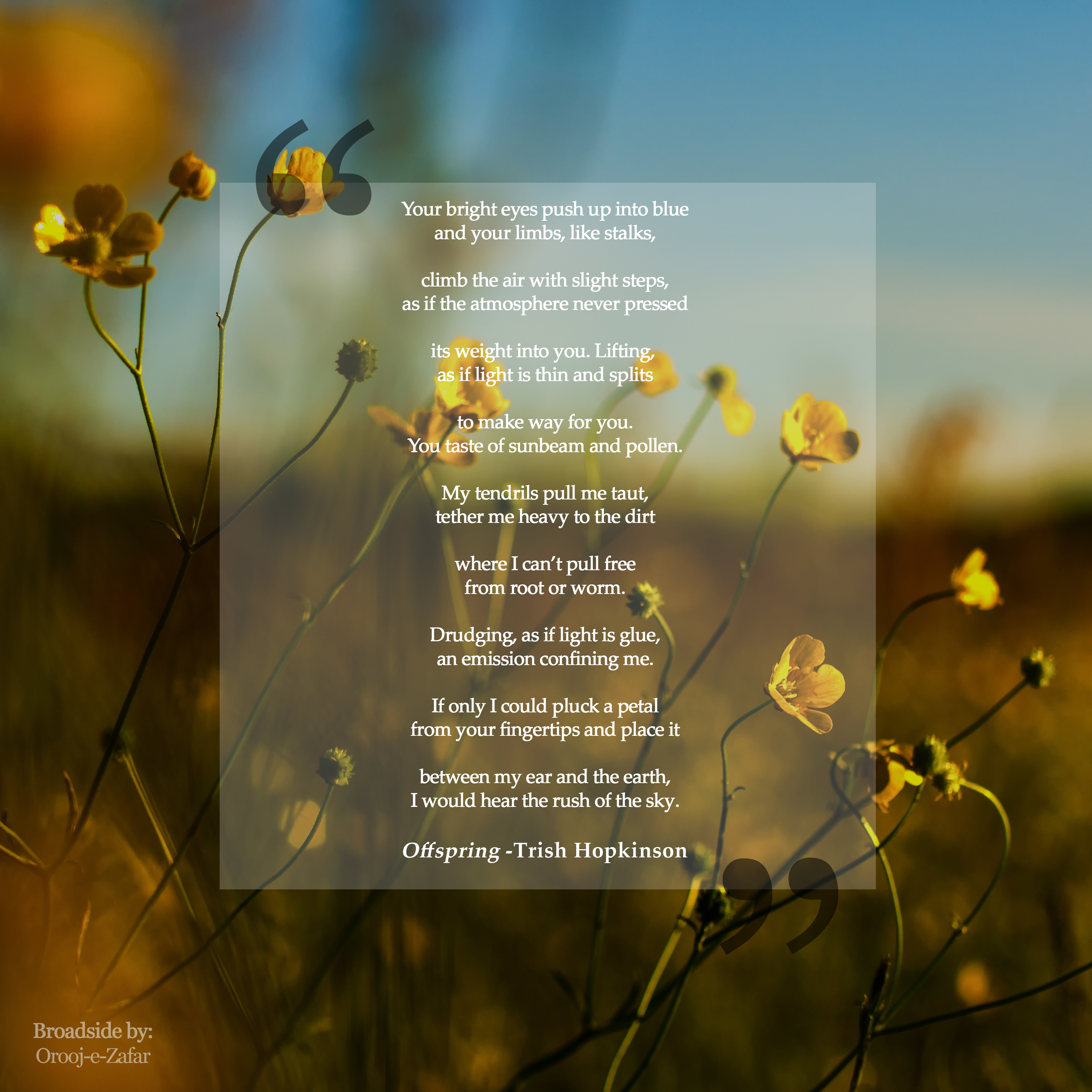 My poem “Offspring,” which was originally published by Stirring in the their July 2016 issue, is featured below in this digital broadside by artist and writer Orooj-e-Zafar. I’m so pleased with the result! Many thanks to Orooj-e-Zafar for creating such a gorgeous representation of my poem. You can see more of […]