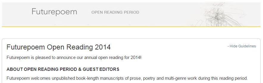 A lovely small and dedicated press in New York, Futurepoem is reading poetry manuscripts in the month of December. DEADLINE: December 31, 2014. Their article by editor Dan Machlin in an article by American Book Review describes their philosophy, “Futurepoem is not small because we can’t. Futurepoem is […]