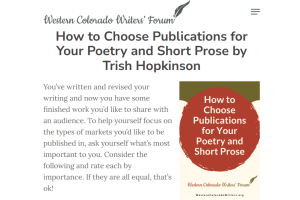 Thank you to Western Colorado Writers’ Forum (WCWF) for publishing my article on how to choose publications for your poetry and short prose! Learn how to help yourself focus on the types of markets you’d like to be published in, where to find markets online, how to research […]