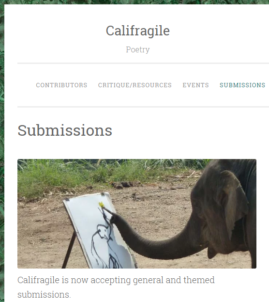 Califragile is a new online poetry journal seeking both unpublished and previously published poems (when rights allow). The About page reads, “In these times when the Earth and humanity seem so breakable, as if they might break each other, we search for answers in the air. What's our […]