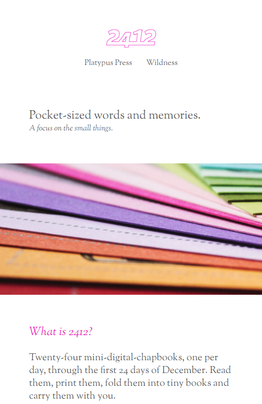 From the same press who launched the literary magazine Wildness, Platypus Press is announcing a new mini-chapbook project entitled 2412! To read more about the press and their editors, read their Masthead page here. I wondered how and why this mini chapbook project came to be, so I asked editor Michelle Tudor a few […]