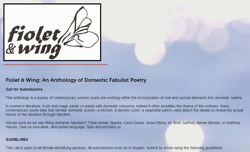 NO FEE Submission call and interview – Fiolet & Wing: Anthology of Domestic Fabulist Poetry, DEADLINE: June 15, 2016