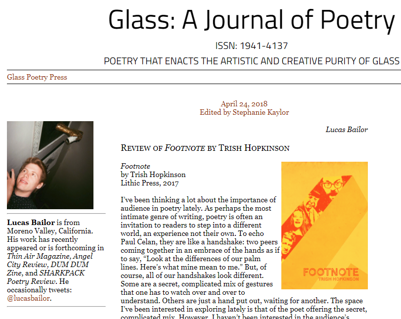 Thank you so much to Lucas Bailor and Stephanie Kaylor of Glass: A Journal of Poetry for this excellent and detailed review of my chapbook Footnote. I was particularly pleased with Bailor’s insight into the collection and why I chose response poems–he’s right, the artists I’m honoring do […]