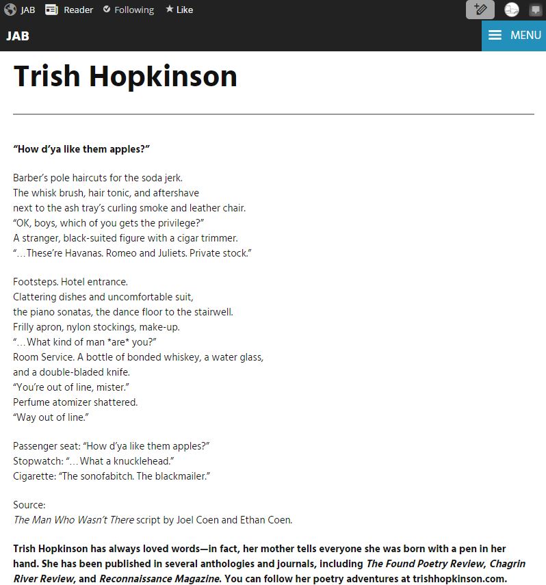 So excited to be published in this great mag along side so many fellow poets whom I admire so much!(Roxanna Bennett, Martin Elwell, Howie Good, and Winston Plowes) Definitely go check out JAB, read the WHOLE found poetry issue, (don’t miss the editorial note) because it is fabulous; […]
