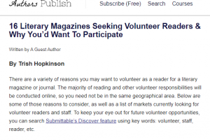 Thank you to Authors Publish for publishing my article with 16 literary magazines currently seeking volunteer readers and information on why you’d want to participate on their resourceful site! Learn the benefits of volunteering, including gaining experience, meeting other writers, improving your own writing and submissions approach, along […]