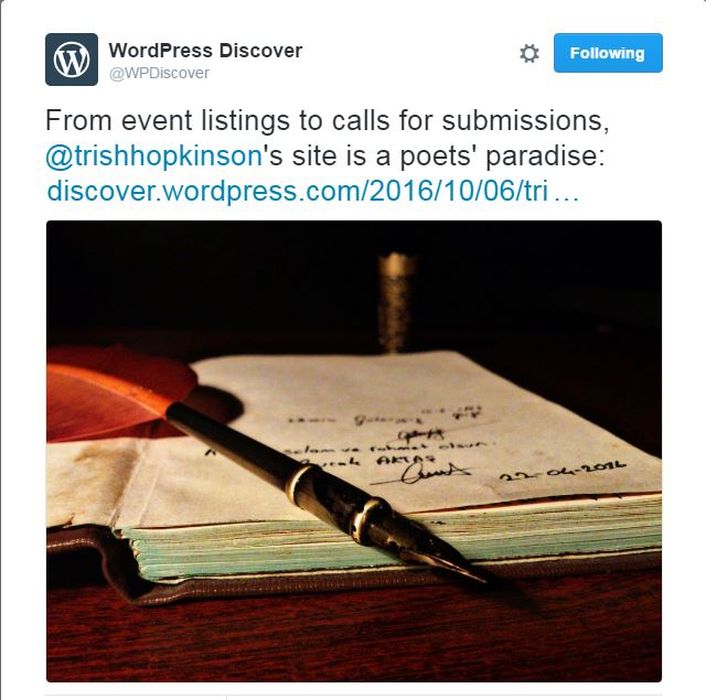 Are you following WordPress Discover yet? If not, you may be missing out on a quick and easy way to find the best blogs on all sorts of topics, including one on Writing blogs! Their generous editors not only featured my blog last week, but also tweeted it […]