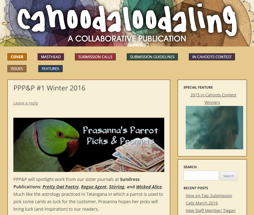 The online lit mag Cahoodaloodaling has a new feature called Prasanna's Parrot Picks & Prompts - that highlights recently published poems from Sundress Publications and then suggests a related prompt for each one. Really excellent work by their new staff member Prasanna Surakanti. Click here to view Prasanna's Parrot Picks & Prompts What […]