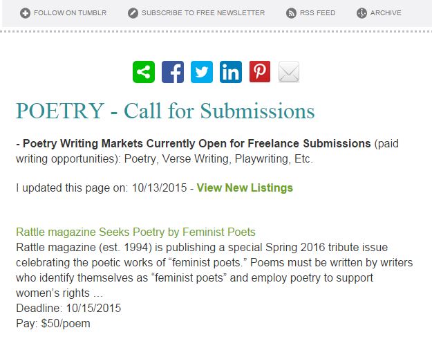 Not only does WritingCareer.com have a HUGE list of current poetry submission calls, they also link to another great service from FreelanceWriting.com–an eNewsletter with lots of upcoming deadlines for writers and poets straight to your email inbox. If you like this post, please share with your writerly friends and/or follow my blog or like my […]